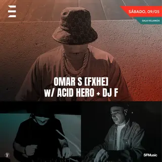 Omar S (FXHE) + Acid Hero + Dj F on May 9, 2026 at Sala Villanos, Madrid features Acid Hero and DJ F (ES) performing electronica DJ sets.