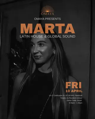 Experience Omaya presents: Marta (music inspired by Tulum, Ibiza, Mykonos, Cape Town) 2026, a significant moment in London, United Kingdom's electronic music calendar on Friday, April 10, 2026. This event brings together artists and fans who share a passion for dance music culture and Tech House, Afro House sounds.