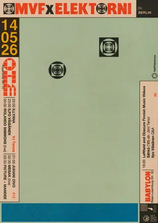 OMVF x Elektorni takes place at OHM in Berlin, Germany on May 14, 2026. Featuring Mesak, Juhani Oivo, Rolando Simmons, Pan Sonic. Club and Electronica sounds all night.
