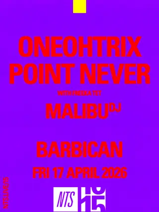 Oneohtrix Point Never, Malibu (NTS 15) on April 17, 2026 at The Barbican Centre, London features Oneohtrix Point Never and Malibu performing experimental DJ sets.