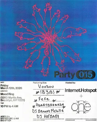 Oneoneone x Internet Hotspot Party 015: Friday the 13th Edition on March 13, 2026 at Mood Ring, New York features DJ Brandy Melville, Fefe and Heartbreaker performing DJ sets.