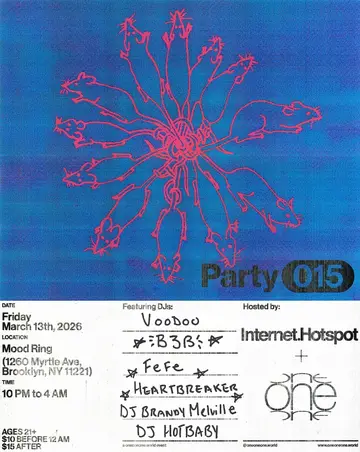 Oneoneone x Internet Hotspot Party 015: Friday the 13th Edition takes place at Mood Ring in New York City, Unknown on Friday, March 13, 2026. Featuring DJ Brandy Melville, Fefe, Heartbreaker.