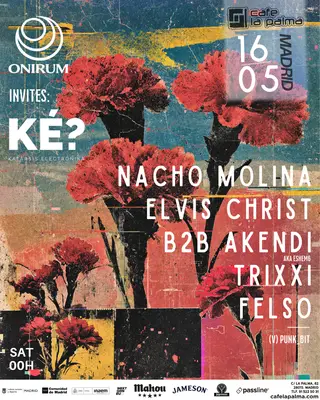 Onirum invites Katársis Electrónika for a special session at Cafe La Palma in Madrid, Spain, on May 16, 2026. This event features a lineup of artists known for their contributions to the house and electronica genres. Nacho Molina is a Spanish DJ and producer recognized for his deep house and electronica mixes. TRIXXI, also hailing from Spain, is known for blending elements of house music with experimental sounds. Felso rounds out the lineup, bringing a unique perspective to the electronica scene. The event will showcase a combination of house and electronica, highlighting the diverse styles of the featured artists.