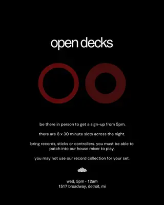 Open Decks on April 15, 2026 at Paramita Sound, Detroit features electronic music performances DJ sets.