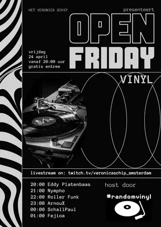 OPEN FRIDAY – RANDOM VINYL - HET Veronica Schip - Vrijdag 24 april 2026 – GRATIS TOEGANG on April 24, 2026 at Veronica Schip, Amsterdam features electronic music performances DJ sets.