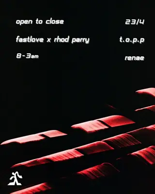 Open To Close with Fastlove & Rhod Parry on April 23, 2026 at renae, Manchester features Fastlove and Rhod Parry performing techno DJ sets.