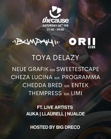 ORII CLUB x BUMPAH takes place at The Cause in London, United Kingdom on Saturday, February 28, 2026. Featuring Neue Grafik, sweetestcape, CHEZA LUCINA, DJ Programma and 6 more. Bass.