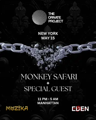 Ornate Project x Muzika: Monkey Safari + Special Guest at Eden in New York, United States on May 15, 2026. Featuring Monkey Safari. Techno and House sounds all night.
