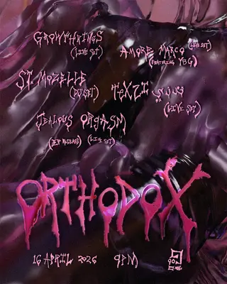 ORTHODOX takes place at 90mil in Berlin, Germany on April 16, 2026. Featuring Yves B Golden, Amore Marco, Jealous Orgasm.
