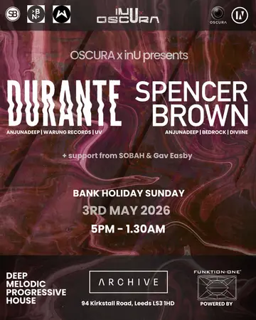 OSCURA x inU presents Durante and Spencer Brown takes place at Archive in Leeds, United Kingdom on Sunday, May 3, 2026. Featuring Durante, Spencer Brown, Gav Easby, SOBAH. Progressive House, House.
