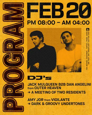 Outer Heaven presents: Jack Mulqueen b2b Dan Angelini takes place at Outer Heaven in New York, United States on Friday, February 20, 2026. Featuring Jack Mulqueen. House.