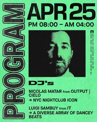 Outer Heaven presents: Nicolas Matar on April 25, 2026 at Outer Heaven, New York City features Nicolas Matar and Luigi Sambuy performing house DJ sets.