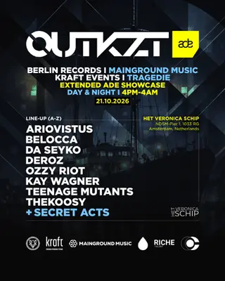 OUTKZT ADE 2026 on October 21, 2026 at Veronica Schip, Amsterdam features ArioVistus, Belocca, DA SEYKO, Kay Wagner, Ozzy Riot, Teenage Mutants and TheKoosy performing techno DJ sets.