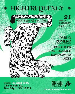 Pablo Romero at High Frequency By: SUKHANYC takes place at El Nico in New York, United States on March 21, 2026. Featuring Pablo Romero, Pablo Flor, David Gaviria, Juan Toca Rico. House and Tech House sounds all night.