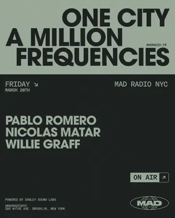 Pablo Romero / Nicolas Matar / Willie Graff takes place at MAD Radio NYC in New York City, Unknown on March 20, 2026. Featuring Pablo Romero, Nicolas Matar, Willie Graff. House, Deep House.