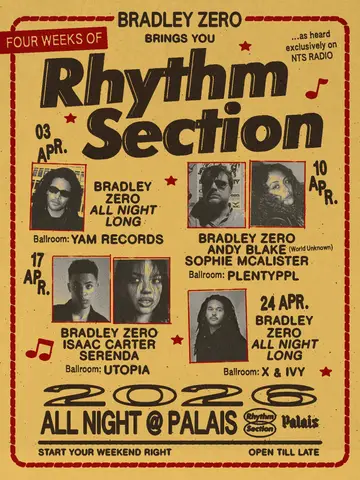 Experience Palais: Bradley Zero, Isaac Carter, Serenda - 4 Fridays of Rhythm Section 2026, a significant moment in London, United Kingdom's electronic music calendar on Friday, April 17, 2026, featuring Bradley Zero, Isaac Carter, Serenda and 0 more artists. This event brings together artists and fans who share a passion for dance music culture and House, Deep House sounds.