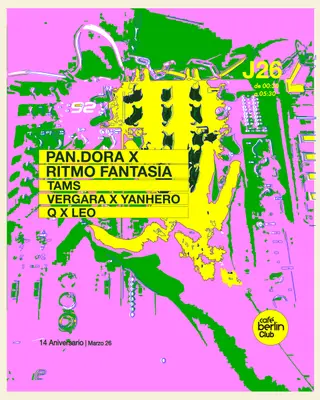 Pandora x Ritmo Fantasía · TAMS · Vergara x Yanhero · Q x Leo on March 26, 2026 at berlinClub, Madrid features electronic music performances house DJ sets.