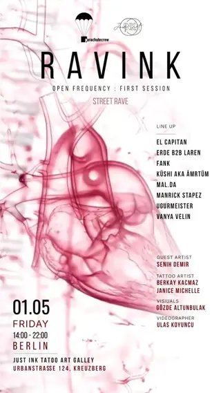 PARACHUTE CREW - RAVINK - FREE STREET RAVE // OPEN FREQUENCY on May 1, 2026 at TBA - Kreuzberg, Berlin features el Capitan, Erde, FANK, Laren, Mal.Da, Manrick Stapez, ugurmeister and Vanya Velin performing techno DJ sets.