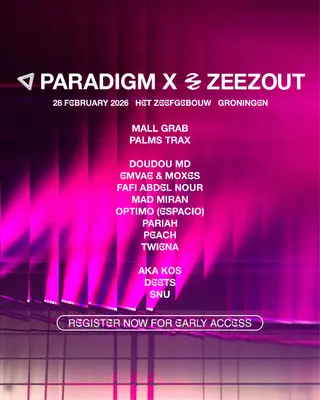Paradigm x ZeeZout on February 28, 2026 at Paradigm, Groningen features Mall Grab, Palms Trax, Doudou MD, Emvae, Moxes, Fafi Abdel Nour, mad miran, Optimo (Espacio), Pariah, Peach, TWIENA, aka Kos, Deets and Snu performing house DJ sets.
