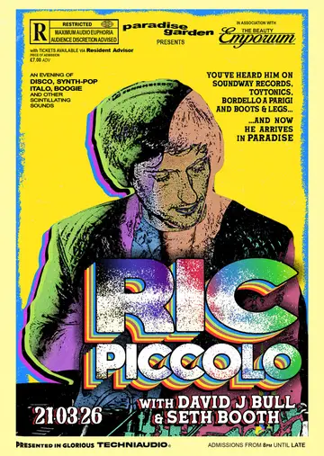 Paradise Garden & The Beauty Emporium present: Ric Piccolo with David J Bull + Seth Booth takes place at Paradise Garden in Brussels, Belgium on Saturday, March 21, 2026. Featuring Ric Piccolo, David J Bull. Disco, Italo Disco.