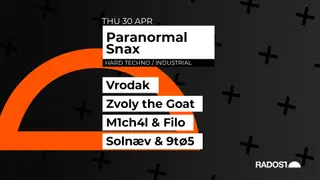 PARANORMAL SNAX w. VRODAK - Zvoly the Goat - Filo - M1ch4l - Solvaev - 9to5 takes place at Radost Music Club in Bratislava, Slovakia on April 30, 2026. Featuring VRODAK. Techno and Industrial sounds all night.