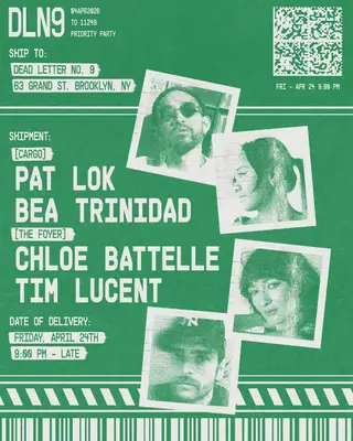 Pat Lok, Bea Trinidad, Chloe Battelle, Tim Lucent - Dead Letter No.9 takes place at Cargo @ Dead Letter No. 9 in New York, United States on April 24, 2026. Featuring Pat Lok, Tim Lucent, Chloe Battelle, Bea Trinidad. Techno and House sounds all night.