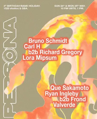 Persona 4th Birthday & Bank Holiday on May 24, 2026 at 1520, Manchester features Bruno Schmidt, Que Sakamoto, Richard Gregory, Lora Mipsum, Carl H, FROND, Ryan Ingleby and Valverde performing progressive house DJ sets.