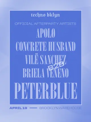 PETERBLUE AFTER PARTY on April 19, 2026 at TBA - Brooklyn, New York City features PETERBLUE, Briela Veneno and Concrete Husband performing DJ sets.