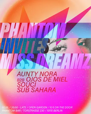 Phantom invites Miss Dreamz takes place at Phantom Bar Berlin in Berlin, Germany on May 2, 2026. Featuring Aunty Nora, Ojos de miel, Souci, Sub Sahara. House sounds all night.