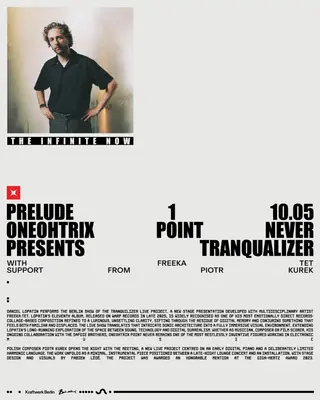 Kraftwerk Berlin in Berlin, Germany hosts Prelude 1 - Oneohtrix Point Never with Freeka Tet on May 10, 2026. Featuring Oneohtrix Point Never, Freeka Tet.
