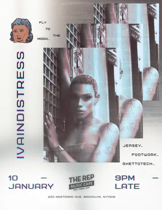 Presenting…ivaindistress This event features Detroit-born DJ and Producer ivaindistress, known for his work in Juke, Ghettotech, and Jersey Club genres. The performance will focus on tracks with a tempo of 140 BPM and above, creating a high-energy atmosphere for attendees. Join us on Saturday, January 10, from 9 PM to 1 AM at The REP Music Cafe in New York.