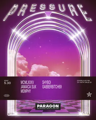 Pressure: MCMLXXXV, Jamaica Suk, Memphy + Shyboi, Gabberbitch69 takes place at Paragon in New York, United States on May 30, 2026. Featuring MCMLXXXV, Jamaica Suk, Memphy, Shyboi and 1 more. Techno and Hardcore sounds all night.