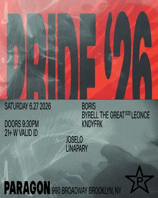 Pride: Boris, Byrell The Great b2b Leonce, KNDYFRK + JOSELO, Linapary on June 27, 2026 at Paragon, New York City features Boris, Byrell The Great, Leonce, Kandylion, SPRFRK, JOSELO and Linapary performing techno DJ sets.