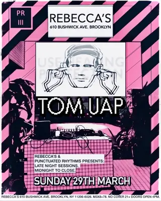 PRIII Late Night Sessions with Tom UAP takes place at Rebecca's in New York City on March 29, 2026. Featuring Tom UAP, Tom Armstrong. Techno, House.