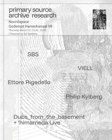 Primary Source Archive Research takes place at Noordspace in Amsterdam, Netherlands on Thursday, March 12, 2026. Featuring SBS (2), VIELL, Philip Kylberg. Techno, Experimental.