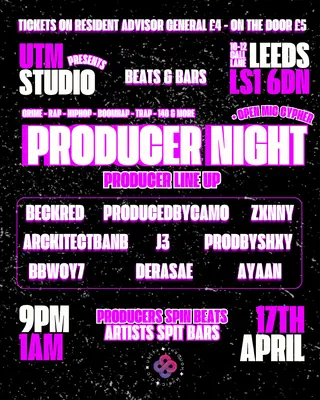 PRODUCER ARTIST CYPHER takes place at 10-12 Call Lane in Leeds, United Kingdom on April 17, 2026. Hip-Hop and Grime sounds all night.