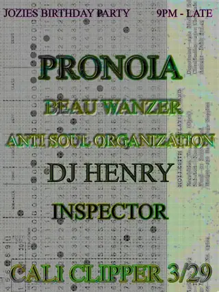 Pronoia takes place at The California Clipper in Chicago, United States on March 29, 2026. Featuring Beau Wanzer. Techno and Hard Drum sounds all night.
