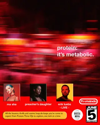 Protein takes place at Bossa Nova Civic Club in New York City on June 5, 2026. The lineup features Erik Luebs, known for his work in the techno genre and his innovative soundscapes. Ma Sha, an emerging artist within the electro scene, will also perform, showcasing her distinct style influenced by various electronic subgenres. Additionally, Preacher's Daughter, recognized for blending elements of techno and house, rounds out the lineup with her unique approach to electronic music. The event will present a focus on techno and electro.