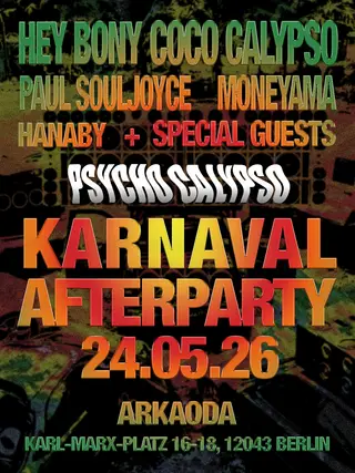 PSYCHO CALYPSO Karnaval After Party takes place at arkaoda Berlin in Berlin, Germany on May 24, 2026. Featuring MONEYAMA, Hanaby. Dancehall and Latin Bass sounds all night.