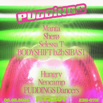 PUDDINGS takes place at Fitzroy in Berlin, Germany on Friday, February 6, 2026. Featuring BODYSHIFT, SIBAST, SELESSA T., Sherø and 1 more. Techno, House.