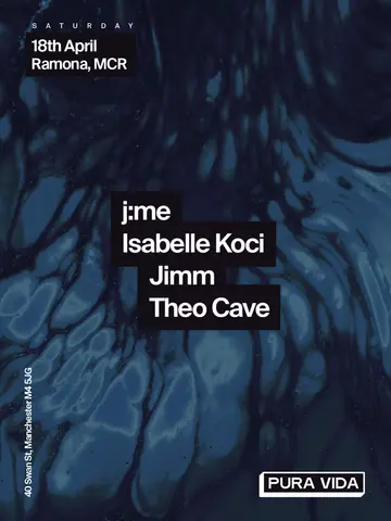 Pura Vida @ Ramona [FREE TICKETS] takes place at Ramona in Manchester, United Kingdom on April 18, 2026. Featuring j:me, Isabelle Koci, Jimm (3), Theo Cave (2). House, Tech House.