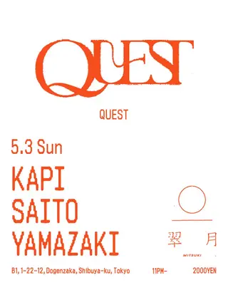 QUEST takes place at Mitsuki in Tokyo, Japan on May 3, 2026. Featuring KAPI, YAMARCHY. Techno and House sounds all night.