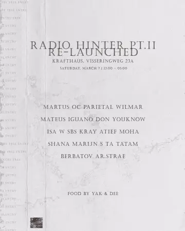 Radio Hinter Pt.II, Re-Launched takes place at Krafthaus in Amsterdam, Netherlands on Saturday, March 7, 2026. Featuring Youknow, ISA W, SBS (2), Kray Atief and 2 more. Dub, Electronica.