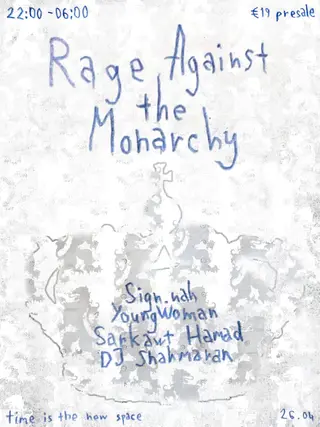 Rage Against the Monarchy on April 26, 2026 at Time is the new space, Rotterdam features Sarkawt Hamad, YoungWoman and DJ Shahmaran performing DJ sets.