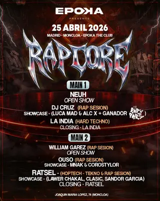 RAPCORE takes place at Epoka The Club in Madrid, Spain on April 25, 2026. Techno and Hip-Hop sounds all night.