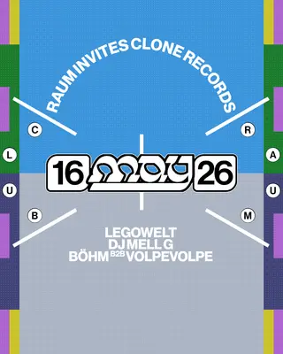 Raum invites Clone Records on May 16, 2026 at CLUB RAUM, Amsterdam features Legowelt, DJ MELL G, Bohm and VOLPEVOLPE performing DJ sets.