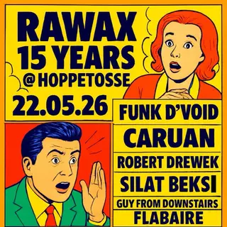 RAWAX 15 YEARS ANNIVERSARY on May 22, 2026 at Hoppetosse, Berlin features Funk D'Void, Caruan, Robert Drewek, Silat Beksi, Flabaire and Guy From Downstairs performing techno DJ sets.