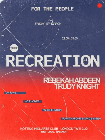 Rebekah Abdeen presents: RECREATION takes place at Notting Hill Arts Club in London, United Kingdom on Friday, March 13, 2026. Featuring Rebekah Abdeen, Trudy Knight. Breakbeat, Techno.