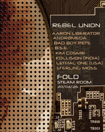 Rebel Union: FOLD - STEAM ROOM takes place at FOLD in London, United Kingdom on Friday, March 20, 2026. Featuring Aaron Liberator, ANDRØMEDA, Kim Cosmik, Kollision and 2 more. Techno, Acid.