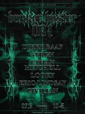 RECKESS RAVES: BUNKER BUSTER takes place at The Bunker in Liverpool, Unknown on Saturday, March 7, 2026. Featuring Ethan Mitchell, LOOKY. Hardcore, Industrial.